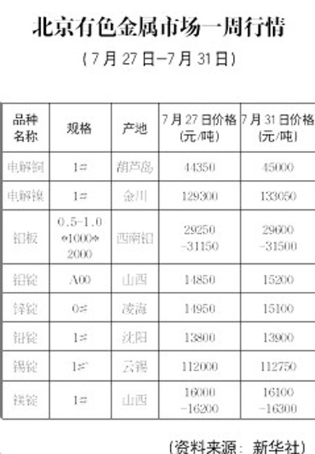 北京有色金融市場一周行情[07.27-07.31]