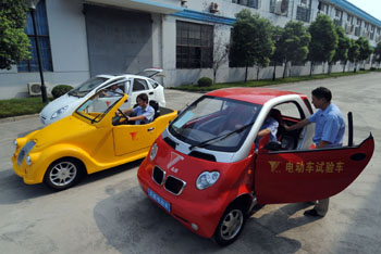 9月10日,浙江省長興縣最大的能源科技企業(yè)的技術(shù)人員正在試用電動汽車。