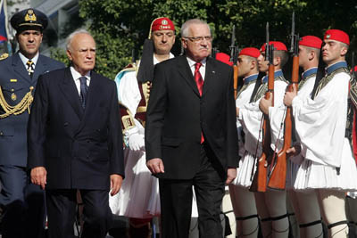 11月22日,在希臘首都雅典,希臘總統(tǒng)帕普利亞斯(前左)為捷克總統(tǒng)克勞斯(前中)舉行歡迎儀式。帕普利亞斯當(dāng)天呼吁歐盟盡快采取措施,以加快歐盟政治一體化進程,提高歐盟在擴大后應(yīng)對各種挑戰(zhàn)的能力。