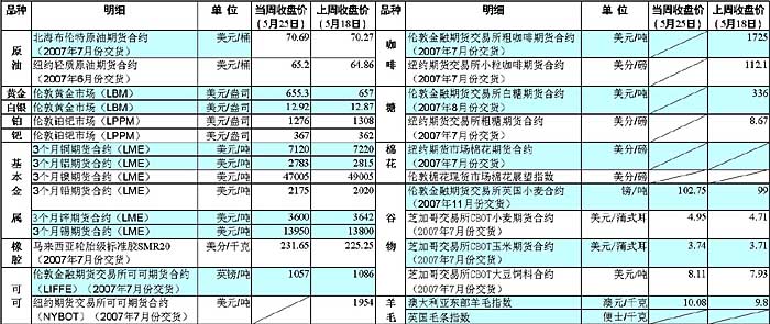 受中國將對精煉鉛征收出口稅的影響,當(dāng)周鉛價創(chuàng)下歷史新高。而由于美國將進(jìn)入夏季駕車外出高峰季節(jié)、非洲產(chǎn)油大國尼日利亞國內(nèi)局勢動蕩以及伊朗形勢緊張,當(dāng)周國際市場原油價格大幅上漲。 受中國從今年6月1日起出口精煉鉛將征收10%的關(guān)稅的影響,當(dāng)周鉛價創(chuàng)下歷史新高。法國巴黎銀行分析師戴維·賽圖表示:“西方一些國家的鉛供應(yīng)將會因為中國對精煉鉛征收出口稅受到影響,致使鉛供不應(yīng)求,這是當(dāng)周鉛價大幅上揚(yáng)的主要原因! 24日,倫敦國際石油交易所7月份交貨的北海布倫特原油期貨盤中價格一度達(dá)到每桶71.8美元,為去年8月28日以來新高。市場分析人士指出,下周一市場因美國陣亡戰(zhàn)士紀(jì)念日停市一天,另外汽油消費(fèi)將在下周進(jìn)入高峰期,投資者在長周末前對市場供應(yīng)的擔(dān)心導(dǎo)致油價上漲。此外,尼日利亞發(fā)生綁架和罷工事件、伊朗局勢持續(xù)緊張也導(dǎo)致油價走高。 貴金屬方面,黃金價格當(dāng)周有所下滑,受此影響鉑金價格繼續(xù)下滑趨勢。瑞銀集團(tuán)(UBS)分析師約翰·里德認(rèn)為,美元價格走強(qiáng)、基本金屬價格走軟以及投資者厭惡風(fēng)險情緒不斷增強(qiáng)是當(dāng)周黃金價格下滑的主要原因。此外,白銀價格略有上漲,美國金屬顧問公司GFMS的一份報告預(yù)測,今年年內(nèi)白銀價格有望突破每盎司15美元,黃金價格也將達(dá)到每盎司700美元。 受投機(jī)者獲利回吐操作影響,可可期貨價格在創(chuàng)下四年以來新高后出現(xiàn)下滑。分析人士指出,可可主要生產(chǎn)地西非地區(qū)近來的極度干旱天氣還在持續(xù),受此影響未來可可價格有望再攀新高。此外,谷物和大豆價格有所上漲。市場擔(dān)心全球小麥庫存緊張以及未來天氣狀況將對全球小麥生產(chǎn)不利,是推動當(dāng)周小麥價格上漲的主要因素。而橡膠價格上揚(yáng)的主要原因則是雨季天氣造成的原料供應(yīng)緊張。