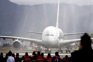 | 26日,一架空中客車A380客機在哥倫比亞首都波哥大的埃爾多拉多機場降落。這是空中“巨無霸”A380在海拔超過2600米的地區(qū)進行起降測試的一部分。新華社/法新 |  美聯(lián)社說,從全球范圍看,未來20年國際航空市場飛機需求量總額預計將達到3萬億美元,而空客與波音兩大飛機巨頭如今已占據(jù)絕大多數(shù)市場份額。然而,兩大巨頭過去幾年中一直指責對方獲得政府非法補貼。