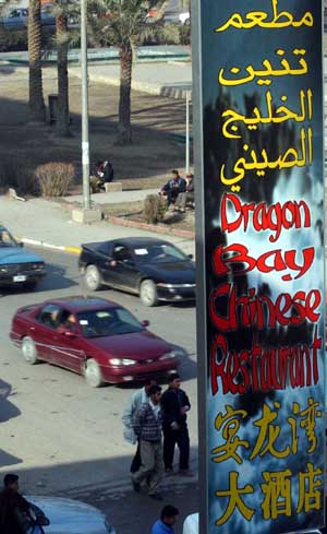 |   該圖為2003年12月31日開業(yè)的宴龍灣大酒店的標(biāo)牌。建立在巴格達(dá)市中心的該酒店是伊拉克戰(zhàn)后首家中國人投資的中餐飯店。新華社記者:黃敬文
