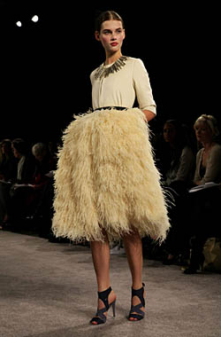 據(jù)美聯(lián)社報(bào)道,萊拉·羅絲和里姆·阿克拉品牌15日分別舉行了2009年秋季時裝發(fā)布會,其間華麗出場的各色珠寶點(diǎn)亮了此前由黑色一統(tǒng)天下的時裝周,鳧藍(lán)色、紫色、暗紅色等顏色的出現(xiàn)也讓人眼前一亮。設(shè)計(jì)師羅絲在服裝中大膽使用翼型設(shè)計(jì),其中金綠色不對稱外衣和綠灰色絲綢薄紗連衣裙尤為引人注目。阿克拉的設(shè)計(jì)靈感來自一尊水下的希臘女神雕像,雕像的流動之美為阿克拉的秋季服飾奠定了基調(diào)。她此次推出的粉色長袍飄逸輕盈,帶有金屬綴片的紫色、藍(lán)色和玫瑰色曳地長裙則讓人聯(lián)想起這位女設(shè)計(jì)師曾為好萊塢女星設(shè)計(jì)的紅地毯禮服。