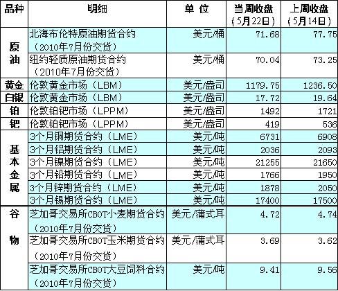 當周以黃金為代表的貴金屬因避險吸引力被美元走強所弱化,各品種期價大跌。上周屢創(chuàng)新高、一枝獨秀的黃金成為在其他市場上損失嚴重的投資者鎖定利潤的主要對象,黃金期價自18日以來連續(xù)4個交易日下跌,本周黃金期價下跌56美元,跌幅達到4.5%,盤中跌至兩周以來低點。21日,德國聯(lián)邦議會批準歐盟與國際貨幣基金組織總額7500億歐元的救助機制,德國將對其中的1480億歐元信貸提供擔保,這在一定程度上緩和了投資者對歐洲主權(quán)債務問題的憂慮,推動歐元兌美元匯率反彈,弱化了黃金的避險吸引力。