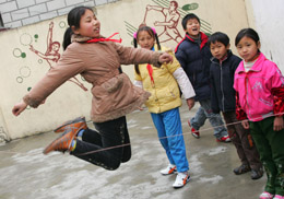 3月16日,惠民中心學(xué)校四年級(jí)一班的陳敏(左)正和伙伴們?cè)谛虏賵?chǎng)上跳皮筋。 為確保農(nóng)民工子女學(xué)校師生安全和健康,上海市教委近日出臺(tái)專門文件,以專項(xiàng)經(jīng)費(fèi)支持形式,重點(diǎn)改善農(nóng)民工子女學(xué)校教室照明以及食堂、廁所等基本設(shè)施設(shè)備,進(jìn)一步優(yōu)化校園環(huán)境。到今年8月31日之前,277所農(nóng)民工子女學(xué)校辦學(xué)條件將大大改善,滬上18萬農(nóng)民工子女將擁有更好的求學(xué)環(huán)境。 |
