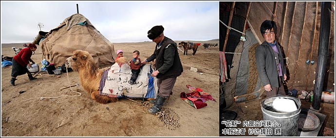 風沙四起,哥哥留下的痕跡頃刻無影無蹤。說起當年的那次迷路,別列提克至今后怕不已:風沙與黑夜無邊無際,自己一個人在沙丘后面躲了7個小時、也哭了7個小時。“要不是哥哥回來找,我肯定死了。” 大風來的時候,羊們會順著風走,只有用鞭子不斷敲打,才能讓它們穩(wěn)住陣腳!帮L沙天,羊走出去50米,你就休想再把它找回來”,別列提克說。 有一年在阿克達拉冬牧場,本村的達吾列提拜和他的羊群都被大風吹走了。后來,人被救了回來,300只羊,一夜之間全沒了。 游牧中的女人最是辛苦。白天要洗衣做飯帶孩子,夜里要看管羊群。一般每兩個小時要走出氈房看一次,大聲吆喝驅(qū)趕野獸,一夜下來只能睡5個小時。遇到刮風下雨天,便整夜不能安睡。 逐水草而居的生活讓牧民落下許多病。最常見的是關(guān)節(jié)炎和心腦血管疾病。前者是因為風吹日曬,后者,是因為人們一路上難得吃到蔬菜,吃肉食太多的緣故。 哈薩克語“荷斯”,指牧民在轉(zhuǎn)場路上暫住一兩天時,所搭起的簡易氈房。它比普通的氈房小很多,勉強可容兩人起居。 在富蘊縣庫爾特鄉(xiāng)的遼闊戈壁灘上,我們走進了哈孜孜別克家的“荷斯”。 “荷斯”低矮,人在里面直不起腰來。地上鋪了一塊小毯子,那是哈孜孜別克的“床”,旁邊還長著稀稀拉拉的幾株草。一只瘸腿的貓,睡眼惺忪地躺在燒著羊糞的鐵爐邊,看見生人也懶得起身。只有那只拴在外面的牧羊犬,自始至終咆哮不已。 哈孜孜別克說,他們已經(jīng)從冬牧場走出來20多天了,還有兩天才能到接羔點。4月份羊羔生下來,長到一個月大,就要跟著羊群一起往下走,直到夏牧場。 人在旅途,比風雪更讓人難以忍受的,是孤獨。從3月起,45歲的漢子哈孜孜別克,將獨自帶領(lǐng)羊群,在準噶爾盆地西南緣與中蒙邊境之間往返一次,走完826公里的全程。每晚陪他解悶的,只有一臺磨掉了漆的收音機。 在青河縣我們又找到了一家“荷斯”,它坐落在一個三面小山環(huán)抱的避風處,距離最近的公路3公里。 “荷斯”的主人、19歲的木拉提,熱情地將我們讓進“荷斯”坐下,邀請喝奶茶。他用一個手提鐵皮桶燒水喝,里面裝的大雪塊尚未化開。 木拉提說,“荷斯”周圍沒有水源,他每天要騎摩托車到三公里以外的地方,裝上兩桶還沒有融化的雪回來,燒水喝。 每半個月左右,木拉提就會騎摩托車到就近的集市買些青菜和土豆回來!耙灿袏蕵罚蔷褪窃诟浇拍恋哪贻p人隔幾天到一起,打打牌! 以木拉提的人生經(jīng)歷,他想像不出城里年輕人怎樣娛樂,無法想像和互聯(lián)網(wǎng)、電影院、KTV關(guān)聯(lián)的生活。 據(jù)說,許多像木拉提這樣獨自放牧的哈薩克人,久而久之,會養(yǎng)成了自說自話的習慣。因為在放牧的時候,他們和牛說話、和羊說話,和沒有生命的任何東西說話…… |