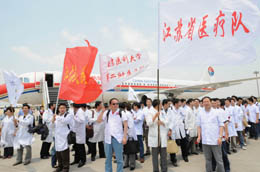 5月13日,由103名醫(yī)護人員組成的江蘇省醫(yī)療隊奔赴四川地震災(zāi)區(qū),并隨機帶去5噸多藥品、器械等醫(yī)療物資以及20萬毫升血液。  新華社記者:孫參 攝