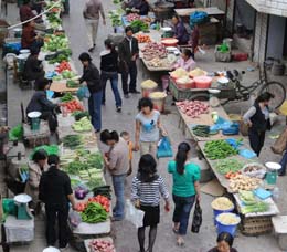 甘肅省隴南市努力做好各項(xiàng)生活必需品供應(yīng),確保因汶川地震而受災(zāi)的群眾生活不出問(wèn)題。5月13日,甘肅省隴南市武都區(qū)的居民在一個(gè)菜市場(chǎng)內(nèi)買(mǎi)菜。 新華社記者:韓傳號(hào)