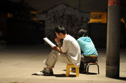 5月20日,什邡縣城的兩位高三學(xué)生在避震棚邊的路燈下復(fù)習(xí)。新華社記者:姜帆
