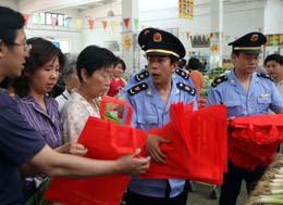 5月28日,北京德勝工商所工作人員在天秀農(nóng)貿(mào)市場(chǎng)發(fā)放倡導(dǎo)環(huán)保理念的免費(fèi)購(gòu)物袋。當(dāng)日,北京市西城區(qū)工商檢查人員深入轄區(qū)內(nèi)各集貿(mào)市場(chǎng),宣傳即將于2008年6月1日起實(shí)施的“限塑令”。新華社記者:張旭
