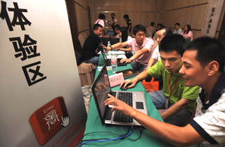 浙江啟動(dòng)“百場(chǎng)萬(wàn)企”電子商務(wù)系列培訓(xùn)。9月10日,工作人員(前右二、右四)在培訓(xùn)浙江的中小企業(yè)負(fù)責(zé)人運(yùn)用網(wǎng)絡(luò)做生意。新華社記者:譚進(jìn)