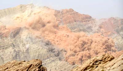 這是新疆輪臺陽霞煤田火區(qū)2號子火區(qū)爆破作業(yè)瞬間(2008年5月13日攝)。