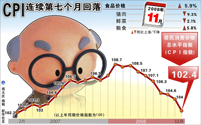 國家統(tǒng)計局11日公布,11月份中國消費價格指數(shù)(CPI)同比上漲2.4%,漲幅比上月快速回落1.6個百分點。今年以來,我國CPI已經(jīng)連續(xù)7個月回落,并創(chuàng)下自2007年2月以來近22個月以來的新低。加上10日公布的11月份生產(chǎn)資料價格(PPI)增幅跳水4.6個百分點,專家認為當前中國面臨的通貨緊縮壓力正在增加。 食品價格走低是主因   對于CPI的連續(xù)回落,申銀萬國證券研究所研究員李慧勇認為,主要源于食品價格的快速下跌。11月份,我國食品類價格同比上漲5.9%,其中豬肉價格下降9.3%,糧食價格上漲5.8%。李慧勇表示,影響食品價格的主要元素價格都處于下降的態(tài)勢,“這個原因可能跟我們之前的政策調(diào)整有關(guān)系。”同時也和翹尾因素的減弱有關(guān)。非食品價格也在回落。11月份,我國非食品價格漲幅僅為0.6%,低于10月份的1.6%與9月份的2%。另外,李慧勇表示,CPI放緩和整個經(jīng)濟周期下行、流動性收縮、居民消費意愿下降也都有關(guān)系。北京航空航天大學(xué)經(jīng)濟學(xué)教授任若恩也認為,國際國內(nèi)經(jīng)濟環(huán)境的不景氣導(dǎo)致需求減弱,是CPI增幅下降的原因。