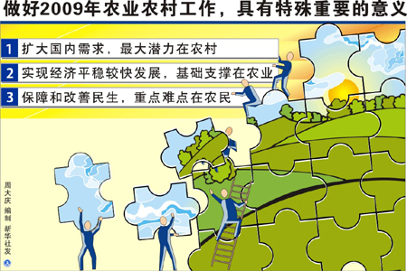新華社北京2月1日電 新華社1日受權(quán)全文播發(fā)《中共中央 國務(wù)院關(guān)于2009年促進(jìn)農(nóng)業(yè)穩(wěn)定發(fā)展農(nóng)民持續(xù)增收的若干意見》!兑庖姟分赋觯仨毲袑嵲鰪(qiáng)危機(jī)意識,充分估計困難,緊緊抓住機(jī)遇,果斷采取措施,堅決防止糧食生產(chǎn)滑坡,堅決防止農(nóng)民收入徘徊,確保農(nóng)業(yè)穩(wěn)定發(fā)展,確保農(nóng)村社會安定。 《意見》共分5部分,約11000字。包括:加大對農(nóng)業(yè)的支持保護(hù)力度;穩(wěn)定發(fā)展農(nóng)業(yè)生產(chǎn);強(qiáng)化現(xiàn)代農(nóng)業(yè)物質(zhì)支撐和服務(wù)體系;穩(wěn)定完善農(nóng)村基本經(jīng)營制度;推進(jìn)城鄉(xiāng)經(jīng)濟(jì)社會發(fā)展一體化。 《意見》指出,2009年農(nóng)業(yè)農(nóng)村工作的總體要求是:全面貫徹黨的十七大、十七屆三中全會和中央經(jīng)濟(jì)工作會議精神,高舉中國特色社會主義偉大旗幟,以鄧小平理論和“三個代表”重要思想為指導(dǎo),深入貫徹落實科學(xué)發(fā)展觀,把保持農(nóng)業(yè)農(nóng)村經(jīng)濟(jì)平穩(wěn)較快發(fā)展作為首要任務(wù),圍繞穩(wěn)糧、增收、強(qiáng)基礎(chǔ)、重民生,進(jìn)一步強(qiáng)化惠農(nóng)政策,增強(qiáng)科技支撐,加大投入力度,優(yōu)化產(chǎn)業(yè)結(jié)構(gòu),推進(jìn)改革創(chuàng)新,千方百計保證國家糧食安全和主要農(nóng)產(chǎn)品有效供給,千方百計促進(jìn)農(nóng)民收入持續(xù)增長,為經(jīng)濟(jì)社會又好又快發(fā)展繼續(xù)提供有力保障。 《意見》指出,做好2009年農(nóng)業(yè)農(nóng)村工作,具有特殊重要的意義。擴(kuò)大國內(nèi)需求,最大潛力在農(nóng)村;實現(xiàn)經(jīng)濟(jì)平穩(wěn)較快發(fā)展,基礎(chǔ)支撐在農(nóng)業(yè);保障和改善民生,重點(diǎn)難點(diǎn)在農(nóng)民。 《意見》指出,擴(kuò)大內(nèi)需、實施積極的財政政策,要把“三農(nóng)”作為投入重點(diǎn)。要進(jìn)一步增加農(nóng)業(yè)農(nóng)村投入,較大幅度增加農(nóng)業(yè)補(bǔ)貼,保持農(nóng)產(chǎn)品價格合理水平,增強(qiáng)農(nóng)村金融服務(wù)能力。 《意見》強(qiáng)調(diào),在農(nóng)業(yè)連續(xù)增產(chǎn)的高基數(shù)上,2009年保持糧食穩(wěn)定發(fā)展的任務(wù)更加繁重。必須加大力度扶持糧食生產(chǎn),穩(wěn)定糧食播種面積,優(yōu)化品種結(jié)構(gòu),提高單產(chǎn)水平,不斷增強(qiáng)綜合生產(chǎn)能力。要支持優(yōu)勢產(chǎn)區(qū)集中發(fā)展油料等經(jīng)濟(jì)作物生產(chǎn),加快發(fā)展畜牧水產(chǎn)規(guī)模化標(biāo)準(zhǔn)化健康養(yǎng)殖,嚴(yán)格農(nóng)產(chǎn)品質(zhì)量安全全程監(jiān)控,加強(qiáng)農(nóng)產(chǎn)品進(jìn)出口調(diào)控。