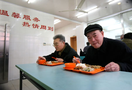 “老年食堂”、“白領(lǐng)午餐”、“零星舊里改造”、“支部建在樓上”……在“全國文明城區(qū)”上海市靜安區(qū),不僅能看到高大的商務(wù)樓宇、整潔的市容市貌,還能從群眾口中聽到這些耳熟能詳?shù)拿~。近年來,靜安區(qū)始終堅(jiān)持把創(chuàng)建工作與“民心工程”相結(jié)合,走出了一條科學(xué)發(fā)展之路。 2月12日,在靜安區(qū)石門二路街道新?道铩皹俘g家園”,社區(qū)的老人們正在用午餐,目前,全區(qū)27個“樂齡家園”每天為老人供應(yīng)午餐、晚餐2500多份,被老人親切地稱作“老年食堂”。 |