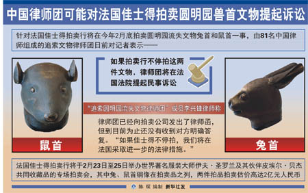 針對(duì)法國(guó)佳士得拍賣行將在今年2月底拍賣圓明園流失文物兔首和鼠首一事,由81名中國(guó)律師組成的追索文物律師團(tuán)日前對(duì)記者表示,如果拍賣行不停拍這兩件文物,律師團(tuán)將在法國(guó)法院提起民事訴訟。 這個(gè)“追索圓明園流失文物律師團(tuán)”成員李興鋒律師說(shuō),律師團(tuán)已經(jīng)向拍賣公司發(fā)出了律師函,但到目前為止還沒(méi)有收到對(duì)方明確答復(fù)!叭绻咽康貌煌E,我們將在法國(guó)采取進(jìn)一步的法律措施! 事實(shí)上,律師團(tuán)自今年1月成立以來(lái)在追索兔首和鼠首文物一事上可謂一波三折。起先,根據(jù)法國(guó)法律規(guī)定,原告需要與事實(shí)有利害關(guān)系,律師團(tuán)一直沒(méi)有找到合適的原告。等確定全球愛(ài)新覺(jué)羅家族宗親會(huì)為原告后,所涉及的高額訴訟費(fèi)以及法院審判需要支付的補(bǔ)償金又沒(méi)了著落。近日,一家房地產(chǎn)公司表示愿意出資40萬(wàn)元支持追索行動(dòng),律師團(tuán)的工作才得以繼續(xù)。 據(jù)了解,法國(guó)佳士得拍賣行將于2月23日至25日舉辦世界著名服裝大師伊夫·圣羅蘭及其伙伴皮埃爾·貝杰共同收藏品的專場(chǎng)拍賣會(huì),其中兔、鼠首銅像在拍賣品之列,兩件拍品拍賣估價(jià)高達(dá)2億元人民幣。 此前有報(bào)道稱國(guó)家文物局博物館司司長(zhǎng)宋新潮表示反對(duì)回購(gòu)。他認(rèn)為既然是中國(guó)的東西,就沒(méi)有必要用中國(guó)的錢(qián)買(mǎi)回來(lái)。這兩件文物都是由于戰(zhàn)爭(zhēng)原因被掠奪到海外的文物,根據(jù)國(guó)際公約,要在道義上進(jìn)行呼吁和追溯,希望其返還。對(duì)于追回方式,他首先不希望通過(guò)拍賣,其次要尊重收藏家意愿,通過(guò)相應(yīng)的補(bǔ)償以回贈(zèng)方式追回,同時(shí)也歡迎和鼓勵(lì)通過(guò)捐贈(zèng)的方式促成回歸。 李興鋒說(shuō):“不管這次追索結(jié)果如何,現(xiàn)在可以看到中國(guó)公眾對(duì)這件事的強(qiáng)烈關(guān)注,激起了人們通過(guò)法律手段實(shí)現(xiàn)保護(hù)國(guó)家財(cái)產(chǎn)的熱情和認(rèn)識(shí),這將為我們今后追索流失文物提供有利經(jīng)驗(yàn)!