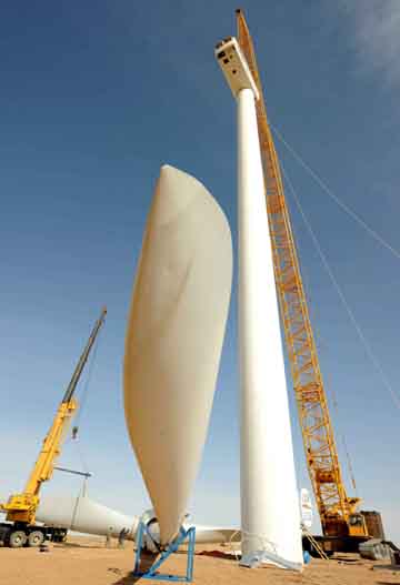 圖為施工人員正在內(nèi)蒙古巴彥淖爾市烏拉特后旗烏力吉風(fēng)電場吊裝風(fēng)機(jī)。到2010年,內(nèi)蒙古風(fēng)電裝機(jī)容量將達(dá)到500萬千瓦以上。本報(bào)記者:張領(lǐng)