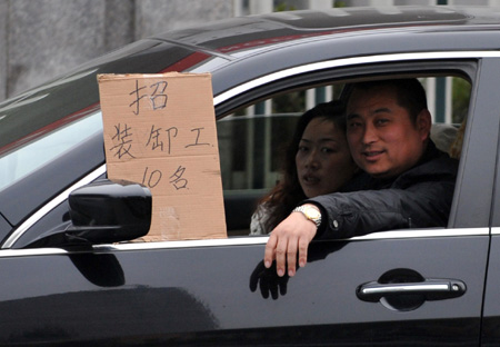 |   一名企業(yè)主開著私家車招農(nóng)民工。本報記者:傅丕毅