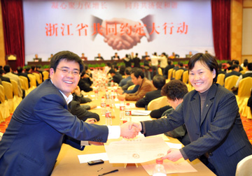 3月19日,來自浙江各地的119家知名國(guó)有與民營(yíng)企業(yè)與本企業(yè)的職工方代表在杭州簽署“共同約定書”,承諾企業(yè)與職工攜手抵御國(guó)際金融危機(jī)給企業(yè)和職工帶來的沖擊,展現(xiàn)企業(yè)與職工利益共同體的形象!肮餐s定書”中企業(yè)承諾自覺承擔(dān)社會(huì)責(zé)任,穩(wěn)定就業(yè)崗位,保障職工合法權(quán)益,在經(jīng)營(yíng)困難期間,做到不裁員或少裁員;職工方承諾與企業(yè)同舟共濟(jì),共渡難關(guān)。遇到問題通過工會(huì)和職工代表大會(huì)等途徑合法解決。本次簽署“共同約定書”的企業(yè)共119家,涉及職工10萬(wàn)多人。圖為中國(guó)電信杭州分公司的企業(yè)方代表(左)和職工方代表(右)在簽署“共同約定書”后握手。