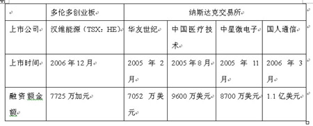 表1:漢維能源與納斯達克部分中國上市公司融資規(guī)模對比表