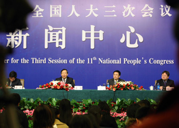|   3月9日,中國(guó)人民銀行副行長(zhǎng)、國(guó)家外匯管理局局長(zhǎng)易綱(左一)就“外匯管理和外匯儲(chǔ)備”問(wèn)題在北京梅地亞中心接受中外媒體的集體采訪。易綱重申,要保持人民幣匯率在合理、均衡水平上的基本穩(wěn)定。新華社記者 袁滿 攝 |    去年末至今年初,西方敦促人民幣升值的言論甚囂塵上,并呈現(xiàn)愈演愈烈之勢(shì)。國(guó)際貨幣基金組織(IMF)3月1日發(fā)布報(bào)告稱,隨著全球經(jīng)濟(jì)逐步回升,人民幣匯率與美元掛鉤如今已成為影響經(jīng)濟(jì)復(fù)蘇的一道障礙,并稱人民幣匯率被明顯低估。這是繼2月初經(jīng)濟(jì)合作與發(fā)展組織(OECD)呼吁人民幣匯率提高靈活性之后,又一國(guó)際經(jīng)濟(jì)組織明確針對(duì)人民幣匯率發(fā)話。與此同時(shí),海外人民幣交易市場(chǎng)暗潮涌動(dòng),在中國(guó)經(jīng)濟(jì)逐步走出危機(jī)的時(shí)刻,各方都在期待著政府工作報(bào)告能夠給人民幣匯率一個(gè)明確說(shuō)法。