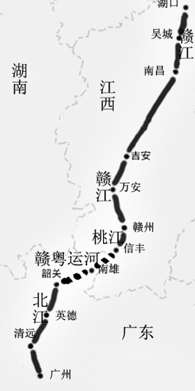 |  在2009年珠江航務(wù)管理局的規(guī)劃中,贛粵運河將自長江的江西省湖口縣起,穿過鄱陽湖入贛江,沿贛江一路向南過贛州市到桃江,過廣東和江西的交界處分水嶺,入廣東湞江上游的孔江水庫,然后沿湞江而下,經(jīng)南雄到韶關(guān),再沿北江干流經(jīng)英德、清遠(yuǎn)至三水河口,入東平水道到達(dá)廣州,全長1282公里,其中江西境內(nèi)748公里,廣東省境內(nèi)534公里。整個航道規(guī)劃為三級航道,通航1000噸級的船舶。 “這事實上是把京杭大運河向南延伸到了廣東,增加了一條南北的大通道!3月24日,珠江航務(wù)管理局珠江水系航運規(guī)劃辦公室副主任雍清贈在接受記者采訪時表示,從北京到廣東,這條運河將貫通黃河、淮河、長江、珠江等中國主要水系,對經(jīng)濟(jì)發(fā)展的促進(jìn)作用不言而喻。