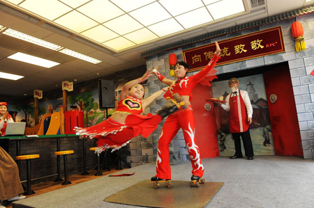 ——“向傳統(tǒng)致敬”集合在一起。一場(chǎng)傳統(tǒng)與創(chuàng)新的主題派對(duì)日前在肯德基北京前門(mén)餐廳舉行。 記者在活動(dòng)現(xiàn)場(chǎng)看到,“肯德基爺爺”手里拿的,正是中國(guó)人喜聞樂(lè)見(jiàn)的經(jīng)典美食——油條豆?jié){。洋快餐賣(mài)起了豆?jié){油條,三字經(jīng)混搭現(xiàn)代歌舞、雜技玩起了滾軸、變臉變出奧巴馬和肯德基爺爺……在傳統(tǒng)演出中加以創(chuàng)新元素,在場(chǎng)觀眾在重溫經(jīng)典中感受到了新鮮和樂(lè)趣。 傳統(tǒng)與創(chuàng)新融合,更具生命力?系禄谶B續(xù)推出的醇豆?jié){和霜糖油條兩款中式產(chǎn)品,目前醇豆?jié){產(chǎn)品成功入主肯德基常規(guī)菜單。新推出的“霜糖油條”在向傳統(tǒng)致敬的基礎(chǔ)上,又大膽創(chuàng)新突破,金黃色的油條批上了一層雪白的糖霜,既借鑒了中國(guó)的傳統(tǒng)美食,又融合了其他國(guó)家午后甜點(diǎn)的“洋”味道。 從老北京雞肉卷到燒餅米飯,再到豆?jié){油條,中國(guó)最傳統(tǒng)的美食飲品被洋快餐陸續(xù)擺上餐桌。專(zhuān)家指出,對(duì)于洋快餐來(lái)說(shuō),“向傳統(tǒng)致敬”既是一個(gè)向中國(guó)消費(fèi)者示好的方式,更意味著他們看好傳統(tǒng)中國(guó)美食的較大市場(chǎng)空間。