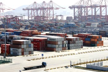上海洋山深水港碼頭集裝箱堆場上的載貨集裝箱等待轉(zhuǎn)運。上海海關近日發(fā)布的上海外貿(mào)進出口數(shù)據(jù)顯示,2010年前4個月上海關區(qū)累計實現(xiàn)進出口總額2002.2億美元,同比增長38.1%。新華社記者
