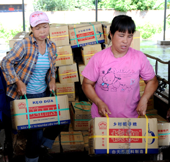 隨著中國—東盟自由貿(mào)易區(qū)的建成以及口岸基礎(chǔ)設(shè)施的完善,廣西愛店口岸邊貿(mào)在快速發(fā)展。圖為7月1日,廣西寧明縣愛店鎮(zhèn)的群眾在愛店口岸貨倉內(nèi)交易椰子糖。新華社記者