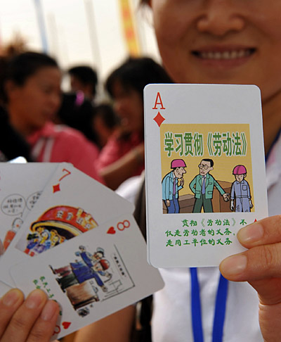 7月28日,一名職工展示普法撲克牌。當(dāng)日,寧夏召開“法律進(jìn)寧東能源化工基地”現(xiàn)場會,在會上向企業(yè)員工發(fā)放《法律知識讀本》、維權(quán)聯(lián)系卡和普法撲克牌,宣傳依法維權(quán)知識。