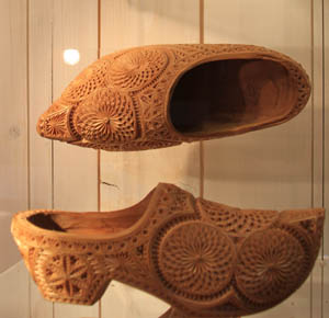 木鞋、風(fēng)車、郁金香,被并稱為荷蘭“三寶”。如今,多數(shù)荷蘭人早已不再穿著木鞋,它更多的成為游客必買的紀(jì)念品以及當(dāng)?shù)厝俗哂H訪友的禮品。但是在阿姆斯特丹北部10多公里外的小城贊丹的郊區(qū),還有一個(gè)小小的木鞋博物館,讓人們品味這荷蘭歷史與文化精雕細(xì)琢而出的精品。 在這家博物館門口,放著一只巨大的木鞋。據(jù)悉,這只長(zhǎng)約三米的木鞋由一整塊木頭制作而成,鞋面漆成黃色,并飾有紅色的條紋,號(hào)稱是世界上最大的木鞋。而走進(jìn)博物館,一條十余米長(zhǎng)的甬道一側(cè),則陳列著上百雙古老的木鞋。 “現(xiàn)存最古老的木鞋是大約800年前制作的,那是人們?cè)诼固氐じ浇牡叵乱馔馔诰虺鰜淼。”胸前扎著一個(gè)木鞋飾物的博物館管理員馬塞爾·凱普敦對(duì)記者說,“直到上個(gè)世紀(jì)60、70年代,木鞋還在荷蘭人的日常生活中占有重要地位,但可惜如今,它更多的只是陳列品與紀(jì)念品了。” 由于木質(zhì)難以長(zhǎng)期保存,加上在幾百年前人們總是習(xí)慣于將舊木鞋當(dāng)作木柴燒掉,因此很難追溯木鞋起源的確切年代。但是木鞋發(fā)展的起因卻很清楚,那正是因?yàn)楹商m獨(dú)特的地理地形——全國(guó)國(guó)土面積約1/4低于海平面,人們?cè)诘屯萏锏乩锔饕约岸褖镜虊蔚绒r(nóng)業(yè)工業(yè)生產(chǎn)生活中,為了保護(hù)腳特別是腳趾而設(shè)計(jì)制作出這種款式獨(dú)特的木鞋。 “木鞋最大的優(yōu)點(diǎn)是安全,可以非常好地保護(hù)你的腳,”一邊說,穿著一雙藍(lán)色木鞋的凱普敦一邊抬起左腳狠狠地向右腳踩下去示意給記者看“特別是腳趾這樣容易受傷的地方!案鶕(jù)不同的用途,荷蘭人對(duì)木鞋做了很多不同的設(shè)計(jì)和改進(jìn)。比如,在傳統(tǒng)的木鞋底下增加較大面積的橡膠墊,能夠幫助人們更好地在泥濘地里干活;給木鞋配上高高的橡膠套,則能夠在草叢密集的地方保護(hù)到腳和腿等更多的地方! 實(shí)際上,荷蘭的木鞋分類極其之多。根據(jù)工作用途劃分有鋪石工木鞋、堤壩工木鞋、泥炭工木鞋、翻土工木鞋、漁夫木鞋、冰上木鞋等;而根據(jù)生活用途劃分還有專門的禮拜鞋、周末木鞋、新娘木鞋等等。 凱普敦介紹說:“制作木鞋的最佳材料是楊木,當(dāng)然還有柳木。不過柳木相對(duì)較少,而且價(jià)格更貴,所以日常用得最多的還是楊木。”博物館內(nèi)有一小塊區(qū)域?qū)iT展示木鞋制作工藝。通常,人們需要將樹干根據(jù)其外形切成木樁,而后根據(jù)具體鞋的大小再切成木塊。隨后,匠人利用斧子以及條刀切割出木鞋的外形,再用匙鉆等工具挖出鞋的內(nèi)部空間。之后,還需要經(jīng)歷風(fēng)干、打磨以及涂繪等工序。一雙木鞋的誕生,大約需要經(jīng)過總共25道工序。 指著墻上的一副照片,凱普敦說:“你看,這是幾十年前人們舉行傳統(tǒng)的冰上婚禮的照片,人人都穿著木鞋!睔v史上,木鞋曾經(jīng)在荷蘭人的戀情中占有獨(dú)特的重要地位!叭绻粋(gè)小伙子向心上人贈(zèng)送的木鞋被接受了,那就說明姑娘也愛上了他!辈┪镳^里就展出了許多這樣精致的新娘木鞋,它們鑲有小玫瑰、星星、魔紐等圖案,表達(dá)著人們對(duì)愛情的美好期待。 “很多人都以為木鞋很笨重,其實(shí)它很輕便,不信你試試!”凱普敦脫下腳上的那雙漂亮的藍(lán)色木鞋,讓記者穿上,果然很輕,甚至和記者原先穿著的那雙運(yùn)動(dòng)鞋分量相當(dāng),抬腳邁足,幾無不便!暗,你穿上木鞋不能像平常那樣走路,而必須將腳勾起來往前邁,腳掌先落地,否則,堅(jiān)硬的木鞋會(huì)傷到你的腳背和腳踝! “畢竟,現(xiàn)在不是以前,”凱普敦指著一雙被涂繪成如今標(biāo)準(zhǔn)的系帶皮鞋模樣的木鞋說:“即便是那些喜歡木鞋的人,也希望能將木鞋做得像皮鞋一樣,”突然之間,這位頭發(fā)灰白的長(zhǎng)者輕嘆一聲,“他們做到了!倍壑,閃過一絲淡淡的憂郁。