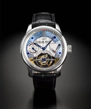 共同研制的心血杰作,兩位獨(dú)立制表大師以四年時(shí)間成功創(chuàng)制出這一枚備有雙體陀飛輪的腕表,內(nèi)外兩組以128件組件制成,互相傾斜30度的陀飛輪框架只重1.17克,更有效抵消地心吸力造成的誤差,將腕表的精準(zhǔn)和復(fù)雜程度推向高峰。腕表表盤上半部以珍珠貝母鑲嵌而成,下半部則采用鏤空設(shè)計(jì),令陀飛輪的優(yōu)美動(dòng)態(tài)表露無遺,肯定是熱愛復(fù)雜機(jī)械腕表的收藏家爭(zhēng)相競(jìng)投的目標(biāo)。