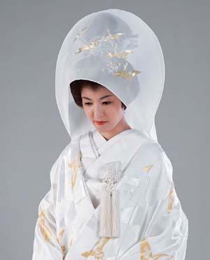 與中國結(jié)婚典禮新娘往往穿著大紅大綠不同,日本神前婚禮時的新娘卻是一身白——身著白色的稱為“振袖”的白色長袖和服,上披白色和式罩衫,稱為“白無垢”,據(jù)說白色是為了讓新郎來染成自己喜歡的顏色,或者是為了證明新娘的純潔。新娘還梳著稱為“文金高島田”的高高的日本發(fā)髻,戴白色絲棉帽子或者蒙白頭紗,胸部插著荷包或者短劍(用于護(hù)身或自殺,現(xiàn)作為裝飾),腳穿白色的日式短布襪,穿草履。新郎則著裝簡單,穿黑色的在肩部、胸和后背飾有家徽的和服、帶條紋的和服裙子,外著短外罩,腳穿日式短布襪,著草履。