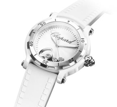 版本的快樂心腕表。白色橡膠表帶飾有象征愛情的符號,三顆鉆石在表盤上不停轉動,其中一顆更被溫柔地抱緊于白金心形的懷抱當中。以一種浪漫而微妙的方式展示著愛與被愛。