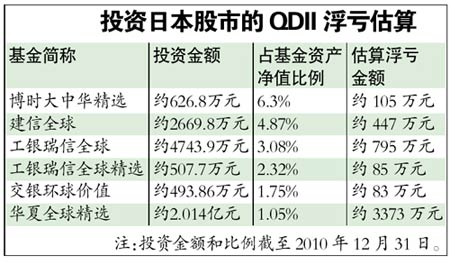 日經(jīng)指數(shù)暴跌,讓投資于日本股市的QDII基金深陷其中。據(jù)統(tǒng)計(jì),目前已經(jīng)成立的QDII基金共有33只,其中投資于日本股市的QDII較少,共有6只,占比不到兩成。據(jù)基金2010年四季報(bào),截至去年12月31日,上述6只QDII基金投資于日本股市總額約2.9億元。據(jù)估算,上述基金兩日浮虧共計(jì)約4888萬元。