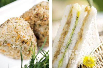 野餐的風(fēng)格很多,時(shí)下最流行的是低碳環(huán)保路線,可以自己在家做一些簡(jiǎn)單容易攜帶的食物,油炸、烘焙、涼拌的食物更加適合保存。比如三明治、壽司、沙拉、飯團(tuán)——彼得·梅爾曾經(jīng)說(shuō):美味的三明治是成功野餐的一半。而飯團(tuán),更是日本人野餐的最愛,在櫻花盛開的季節(jié),幾乎所有在櫻花樹下鋪開一張漂亮花布的賞櫻者,都會(huì)帶上手工制作的美味飯團(tuán)。除了食物的烹飪方式,食材的選擇也很重要,就拿壽司來(lái)說(shuō),魚生類壽司很容易因?yàn)闀r(shí)間和溫度的原因變質(zhì),而熟食做的壽司就可以保留得更好。朋友聚會(huì)的話,不妨規(guī)定每個(gè)人帶一個(gè)菜,互相分享。