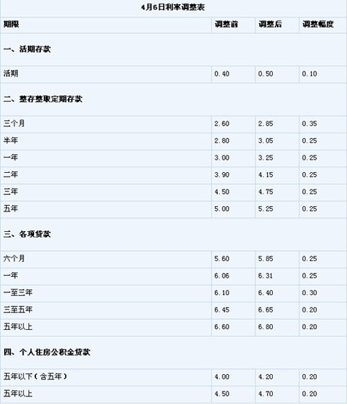中國人民銀行決定,自2011年4月6日起上調(diào)金融機(jī)構(gòu)人民幣存貸款基準(zhǔn)利率。金融機(jī)構(gòu)一年期存貸款基準(zhǔn)利率分別上調(diào)0.25個百分點,其他各檔次存貸款基準(zhǔn)利率及個人住房公積金貸款利率相應(yīng)調(diào)整(見附表)。