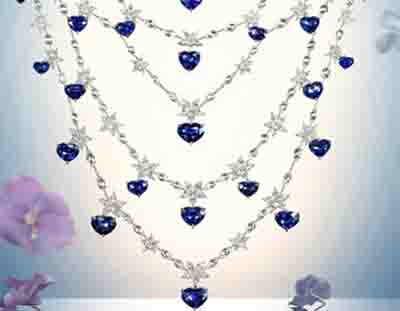 這款由形狀各異的鉆石與心形切割藍寶石組成的五排項鏈,完美詮釋了蕭邦高雅精致、無與倫比的高級珠寶創(chuàng)作傳統(tǒng)。