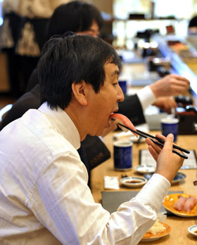 記者注意到,這里壽司上的魚片要比別的地方長,幾乎像一個軟殼從上到下把米飯整個包住。相比之下,米飯的量顯得比其他壽司店少。店主說,在這里,魚和肉的最佳比例也是祖?zhèn)鞯!斑@種比例,可以讓客人將魚的鮮美品味到極致。本來,壽司店里魚是主角,飯是配角。但現(xiàn)在很多快餐式的壽司,反而讓人感覺在吃飯,體味不到魚的香味!