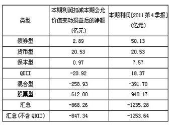 | 隨著部分基金公司2011年四季報數(shù)據(jù)的披露,其當(dāng)期財務(wù)數(shù)據(jù)也部分浮出水面。從納入統(tǒng)計范圍的29家基金公司旗下367只基金情況看,偏股型基金成為拖累“創(chuàng)收”的最大因素,股票型基金和混合型基金合計虧損441.35億元。 | | | |