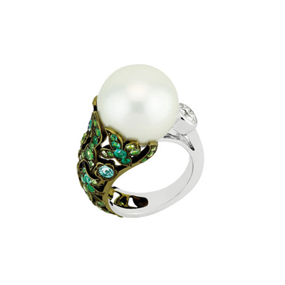潔白珍珠在明亮陽(yáng)光和青綠調(diào)的映襯下更顯生動(dòng),飽滿(mǎn)的球面閃耀晶瑩七彩,正是乍暖還寒,宛若一縷輕風(fēng)徐徐送和,回繞在皚皚白雪下的冬日花園“Jardin
