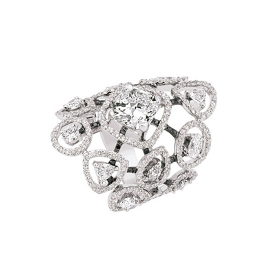 全新頂級(jí)珠寶系列將這個(gè)精髓發(fā)揮至極,種種對(duì)比元素自由地奇妙組合,帶來(lái)無(wú)以言喻的視覺(jué)沖擊:既形象生動(dòng)又感性魅惑,既有強(qiáng)烈的結(jié)構(gòu)感又流動(dòng)變幻。色彩的運(yùn)用同樣大膽,出其不意地打破色調(diào)的平衡,卻由此締造獨(dú)一無(wú)二的和諧。圓形和不規(guī)則幾何形隨性碰撞,光影迭映,交織出如夢(mèng)如幻的協(xié)調(diào)韻律。