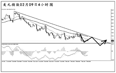 如圖所示,美元指數(shù)再度強力創(chuàng)出新低,日線圖MACD仍未擺脫空頭動能充盈的階段。4小時圖下降趨勢線和均線系統(tǒng)的壓制作用完好,美元指數(shù)下方的下跌空間仍然廣闊。短線持續(xù)發(fā)生了空頭動能減弱的信號,但在突破趨勢線之前,預計效果一般。后市美元指數(shù)向趨勢線一帶發(fā)起回調(diào)之后繼續(xù)下跌的概率較大。