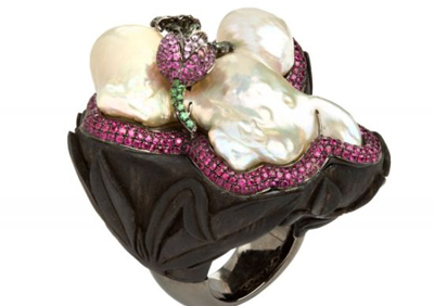 花朵戒指:18ct白金戒指,寶石與珍珠完美結合的典范,石榴紅色的寶石搭配綠色寶石惟妙惟肖地體現(xiàn)出了花朵的造型。
