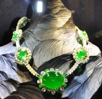 帶來數(shù)款價(jià)值超過億元的昂貴珠寶作品。其中采用頂級(jí)帝王翡翠主石(37.45*30.43毫米)制作的《長城》價(jià)值5億6千萬港元;另一件《悟禪知翠》同樣采用頂級(jí)帝王翡翠,蟬抱碧潤翡翠主石,背面巧鑲紫玉,估價(jià)3億港元。