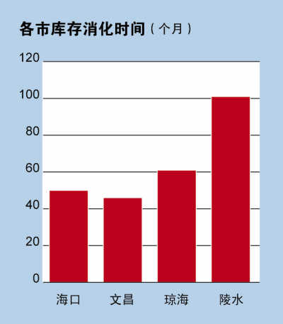 根據(jù)海南克爾瑞的統(tǒng)計(jì)數(shù)據(jù),海南樓盤(pán)庫(kù)存量最低的是三亞市,截至2012年11月底,三亞仍需要2年消化完。而其他重點(diǎn)城市如海口樓市庫(kù)存消化周期長(zhǎng)達(dá)50個(gè)月,文昌需要46個(gè)月,瓊海需要61個(gè)月,庫(kù)存最高的的陵水則需要101個(gè)月。