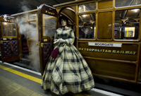 隨著夜色中的一聲汽笛,一輛19世紀(jì)蒸汽機(jī)車?yán)S多利亞時代的木制車廂駛?cè)雮惗氐罔F穆爾蓋特車站,白色蒸汽從紅色車頭上冒出來,煤氣味在空中彌漫,這一幕似乎把人們帶回到了1863年。那一年1月9日,倫敦開通了世上第一條地鐵線路。