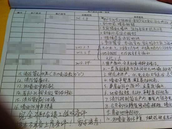 事發(fā)當日,柳女士來到綠地商務城售樓處想討個說法,工作人員讓柳女士在留言簿上寫下自己的意見。柳女士現(xiàn)場所拍留言本簿的照片顯示,3月份有三十余位業(yè)主留下了自己的意見。業(yè)主夏先生3月9日的留言達16條之多,主要涉及房屋布局與效果圖差異較大、水電暖等基本設(shè)施不到位、房屋施工粗糙等問題。