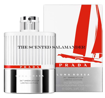 Rossa隊的努力,Prada發(fā)行了紀念34屆美洲杯的珍藏版。瓶身下方與噴頭描出平行的線條,代表著AC72對稱的船型;白色豎紋則代表40公尺高的帆。紅色裝飾突顯了運動感,但依然忠于品牌崇高與性感的特有標志。外盒設計加上了Luna