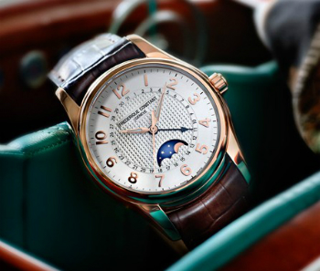 精鋼表殼版本配以高貴黑色真皮表帶以及折疊帶扣。FC-330腕表同樣備有43mm直徑玫瑰包金版本,銀色表盤與中央guilloché紋飾對比強烈,配以人手裝嵌的鍍金阿拉伯數(shù)字。腕表其余規(guī)格一如精鋼版本,